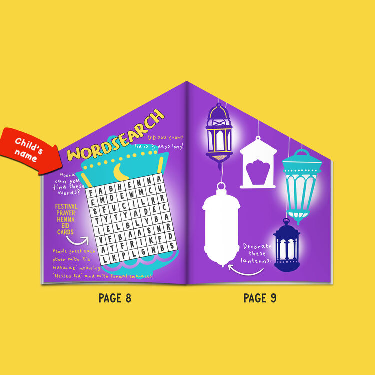 A gorgeous Eid activity book that stars your child. Full of colourful activities in a quirky, house shaped book.