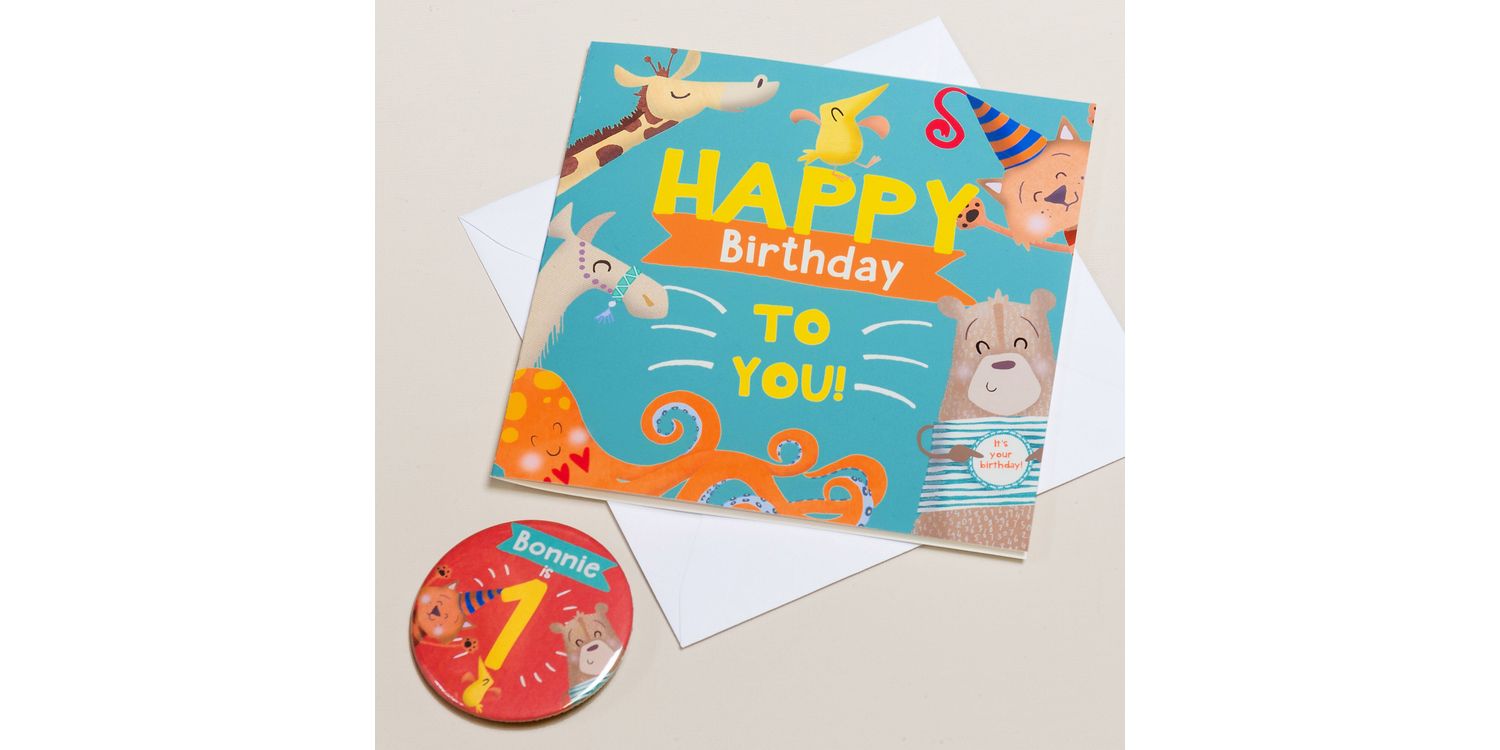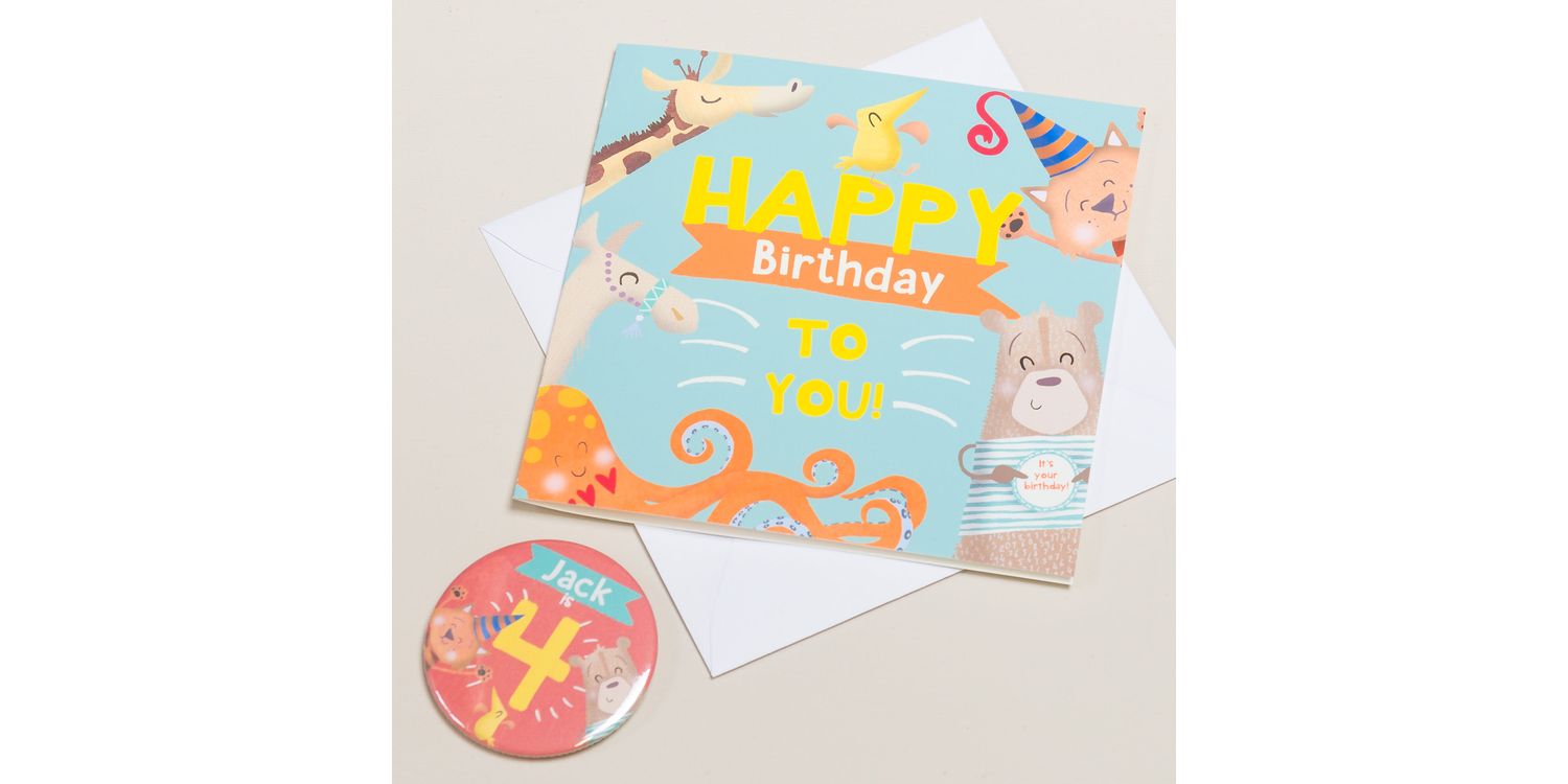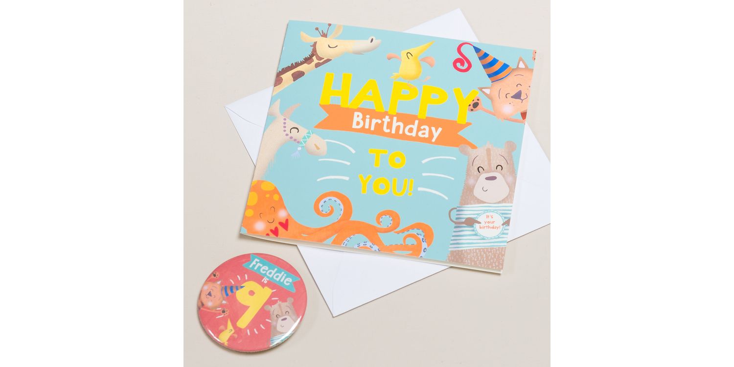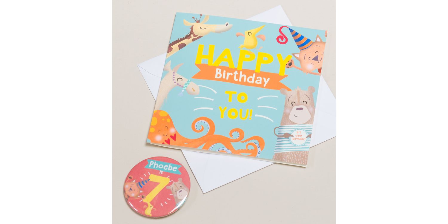A beautifully illustrated birthday card and personalised badge perfect for any child!