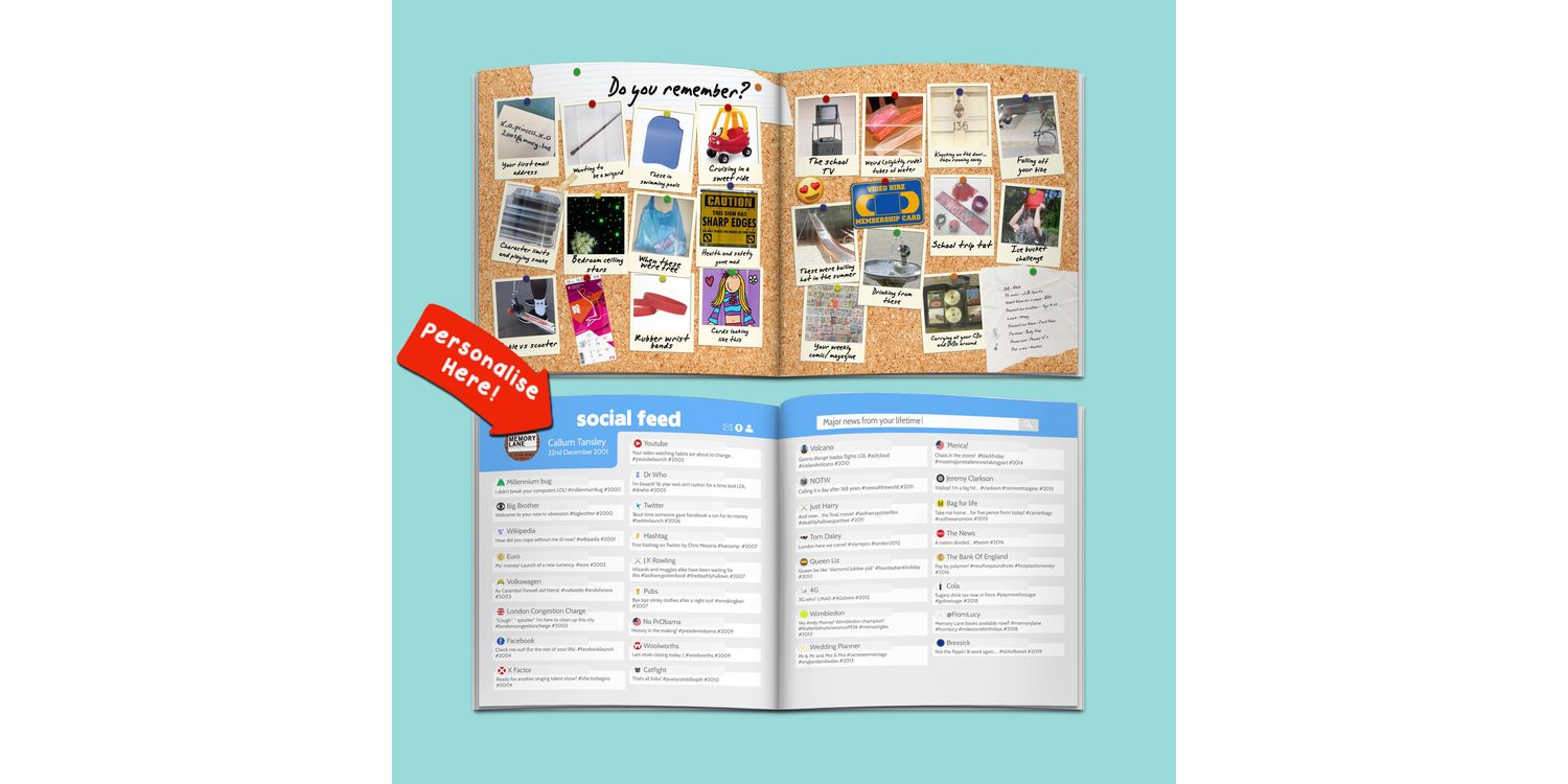 The book is full of funny recollections about the UK in the 2000s and 2010s. The 44 pages are all hand illustrated by our incredible team and feature references to the recipient's name and each subject is tackled in an original and entertaining way, including a retro TV listings guide, a gamers snakes and ladders board, a very colourful washing line full of fashions of the time and even a huge car scrapheap!