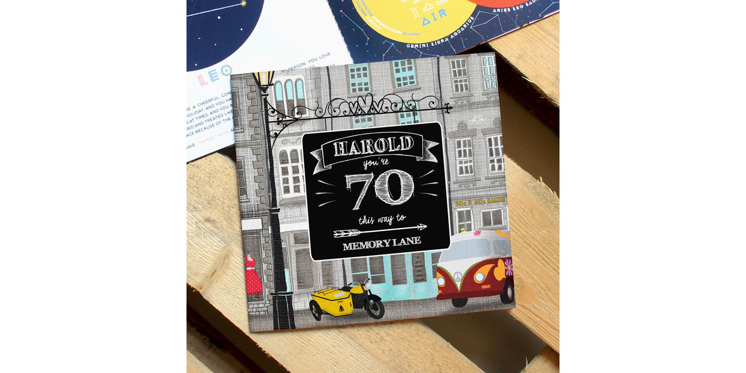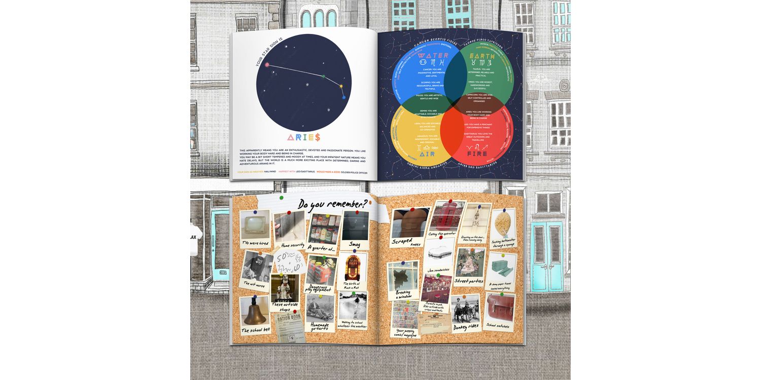 The book is full of funny recollections about the UK in the 50s and 60s. The 44 pages are all hand illustrated by our incredible team and feature references to the recipient's name and each subject is tackled in an original and entertaining way, including a retro TV listings guide, a gamers snakes and ladders board, a very colourful washing line and even a huge car scrapheap!